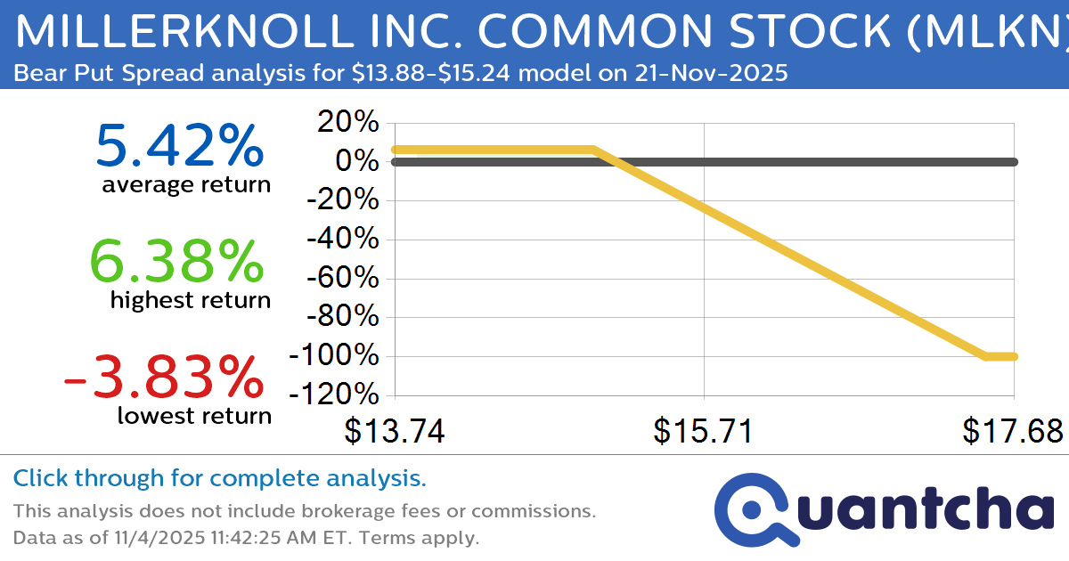 Quantchabot has detected a new Bear Put Spread trade opportunity for MILLERKNOLL INC. COMMON STOCK (MLKN) for the 21-Nov-2025 expiration period. You can analyze the opportunity in depth over at the Quantcha Options Search Engine.