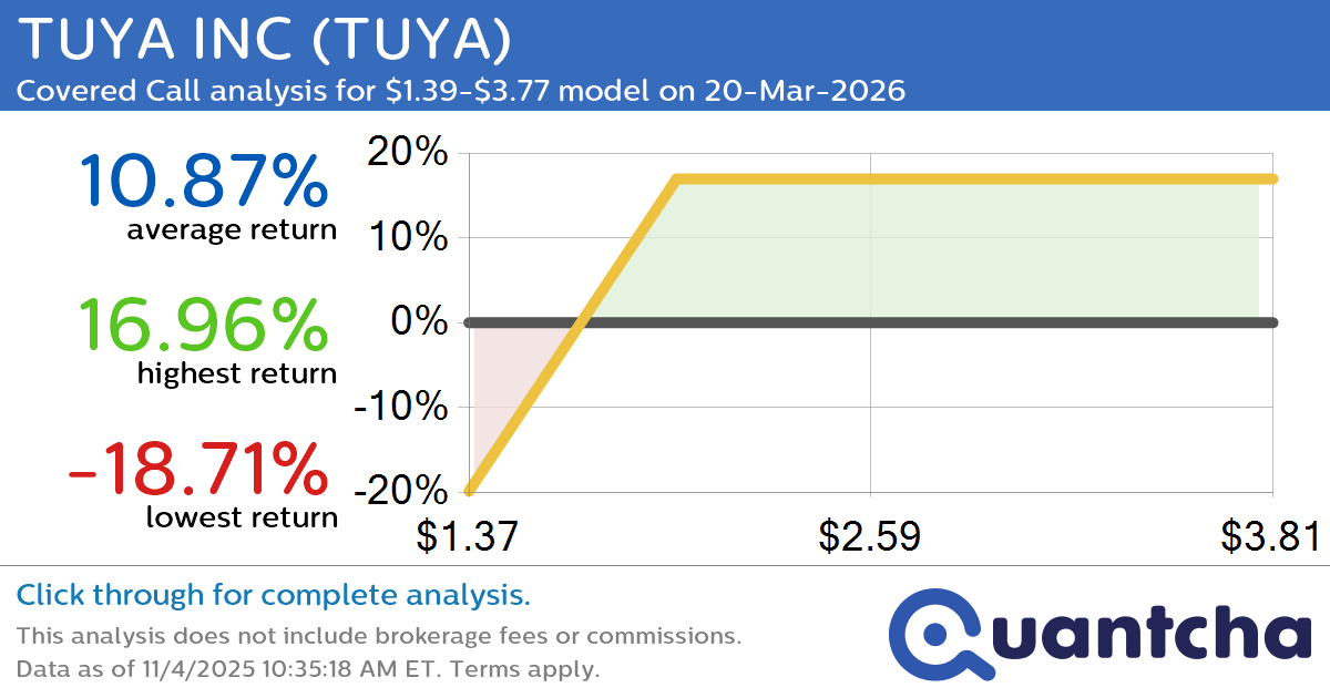 Quantchabot has detected a new Covered Call trade opportunity for TUYA INC (TUYA) for the 20-Mar-2026 expiration period. You can analyze the opportunity in depth over at the Quantcha Options Search Engine.