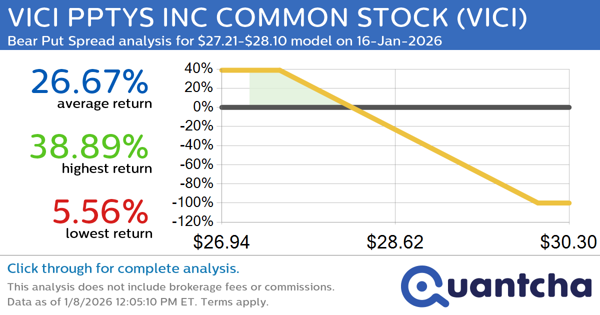 Quantchabot has detected a new Bear Put Spread trade opportunity for VICI PPTYS INC COMMON STOCK (VICI) for the 16-Jan-2026 expiration period. You can analyze the opportunity in depth over at the Quantcha Options Search Engine.