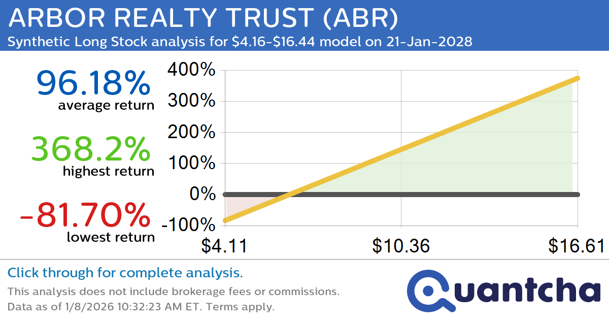 Quantchabot has detected a new Synthetic Long Stock trade opportunity for ARBOR REALTY TRUST (ABR) for the 21-Jan-2028 expiration period. You can analyze the opportunity in depth over at the Quantcha Options Search Engine.