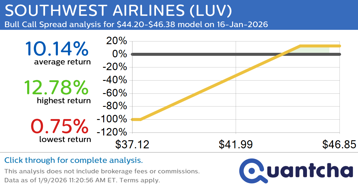 Upside potential: Using this bullish strategy, the trade would be profitable if SOUTHWEST AIRLINES closes at or above $44.14 on 16-Jan-2026. Based on our risk-neutral analysis, there is a 51.03% likelihood of this return.