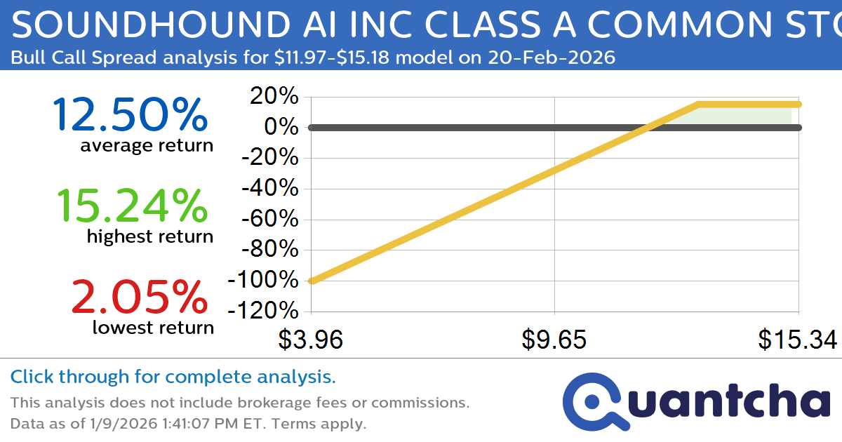 Quantchabot has detected a new Bull Call Spread trade opportunity for SOUNDHOUND AI INC CLASS A COMMON STOCK (SOUN) for the 20-Feb-2026 expiration period. You can analyze the opportunity in depth over at the Quantcha Options Search Engine.
