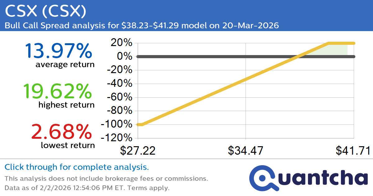 Quantchabot has detected a new Bull Call Spread trade opportunity for CSX (CSX) for the 20-Mar-2026 expiration period. You can analyze the opportunity in depth over at the Quantcha Options Search Engine.