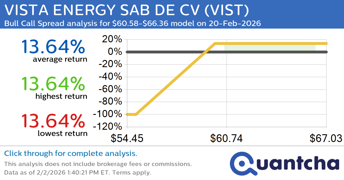 Quantchabot has detected a new Bull Call Spread trade opportunity for VISTA ENERGY SAB DE CV (VIST) for the 20-Feb-2026 expiration period. You can analyze the opportunity in depth over at the Quantcha Options Search Engine.