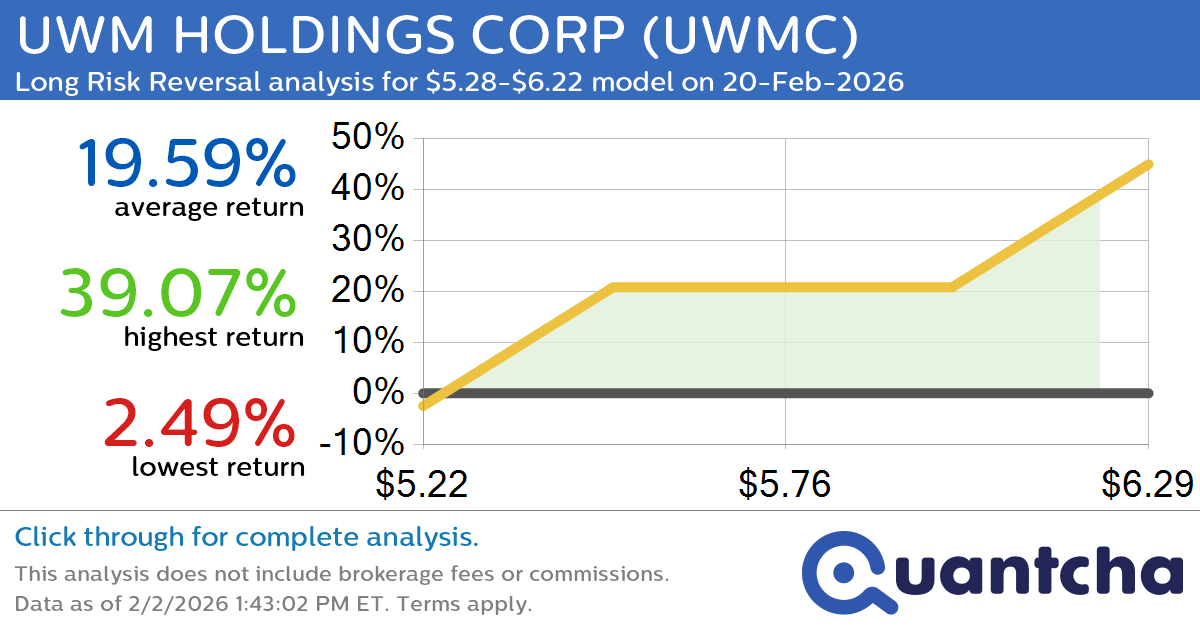 Quantchabot has detected a new Long Risk Reversal trade opportunity for UWM HOLDINGS CORP (UWMC) for the 20-Feb-2026 expiration period. You can analyze the opportunity in depth over at the Quantcha Options Search Engine.