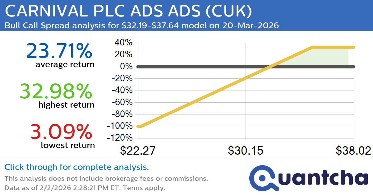 Quantchabot has detected a new Bull Call Spread trade opportunity for CARNIVAL PLC ADS ADS (CUK) for the 20-Mar-2026 expiration period. You can analyze the opportunity in depth over at the Quantcha Options Search Engine.