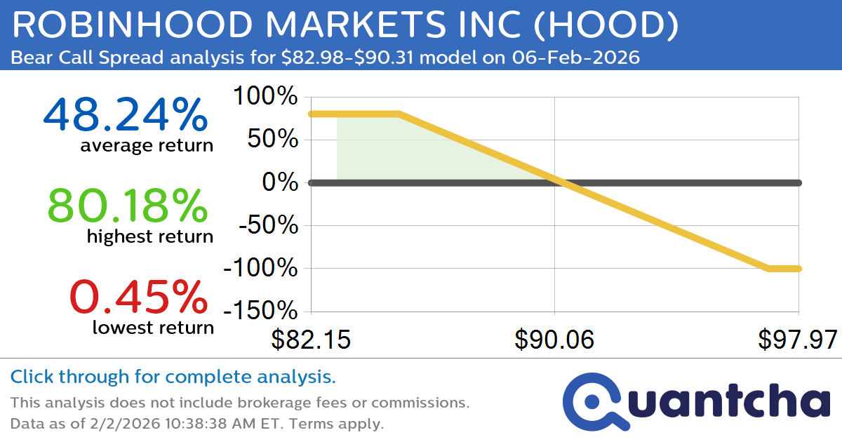 Quantchabot has detected a new Bear Call Spread trade opportunity for ROBINHOOD MARKETS INC (HOOD) for the 6-Feb-2026 expiration period. You can analyze the opportunity in depth over at the Quantcha Options Search Engine.