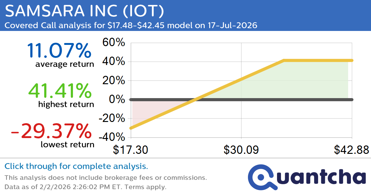 Quantchabot has detected a new Covered Call trade opportunity for SAMSARA INC (IOT) for the 17-Jul-2026 expiration period. You can analyze the opportunity in depth over at the Quantcha Options Search Engine.