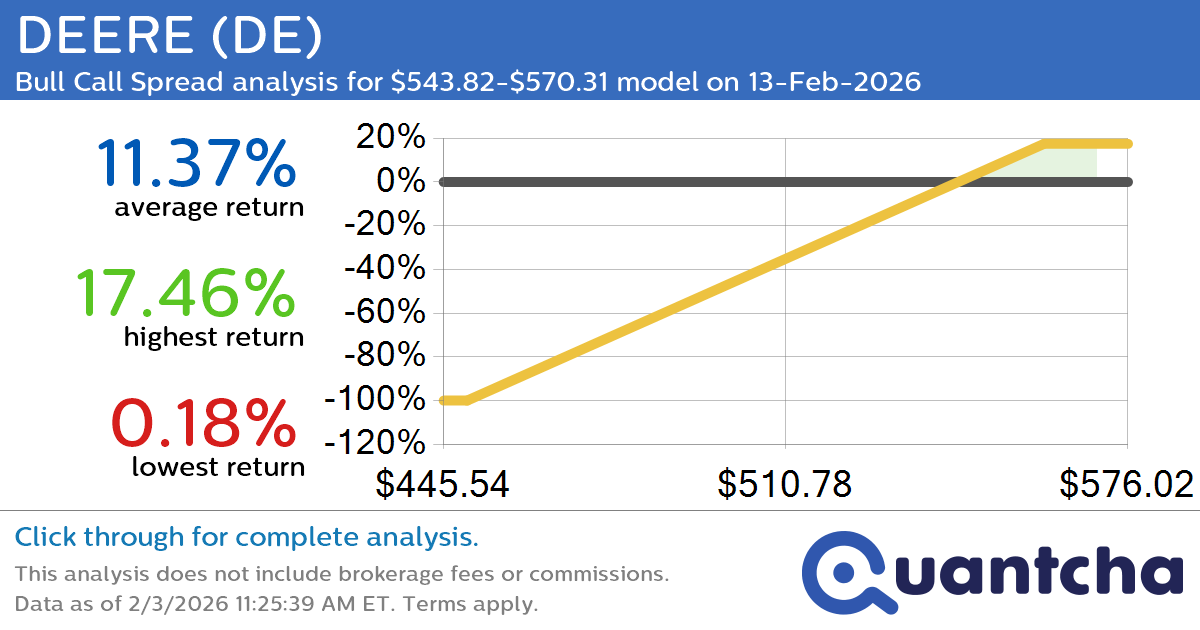 Quantchabot has detected a new Bull Call Spread trade opportunity for DEERE (DE) for the 13-Feb-2026 expiration period. You can analyze the opportunity in depth over at the Quantcha Options Search Engine.