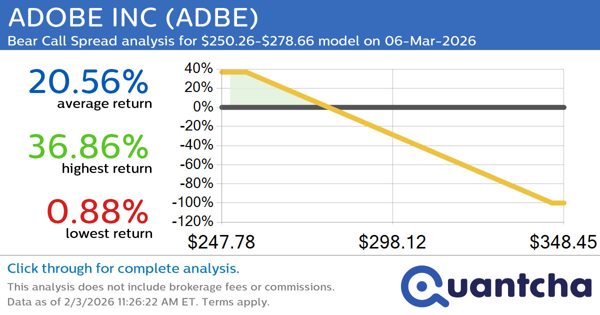 Quantchabot has detected a new Bear Call Spread trade opportunity for ADOBE INC (ADBE) for the 6-Mar-2026 expiration period. You can analyze the opportunity in depth over at the Quantcha Options Search Engine.