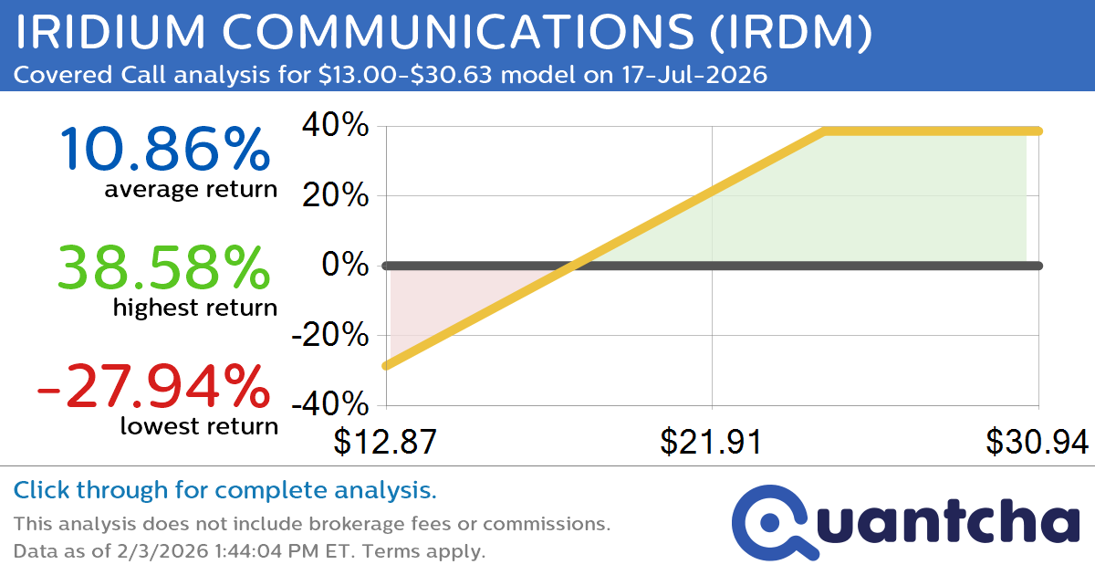 Quantchabot has detected a new Covered Call trade opportunity for IRIDIUM COMMUNICATIONS (IRDM) for the 17-Jul-2026 expiration period. You can analyze the opportunity in depth over at the Quantcha Options Search Engine.