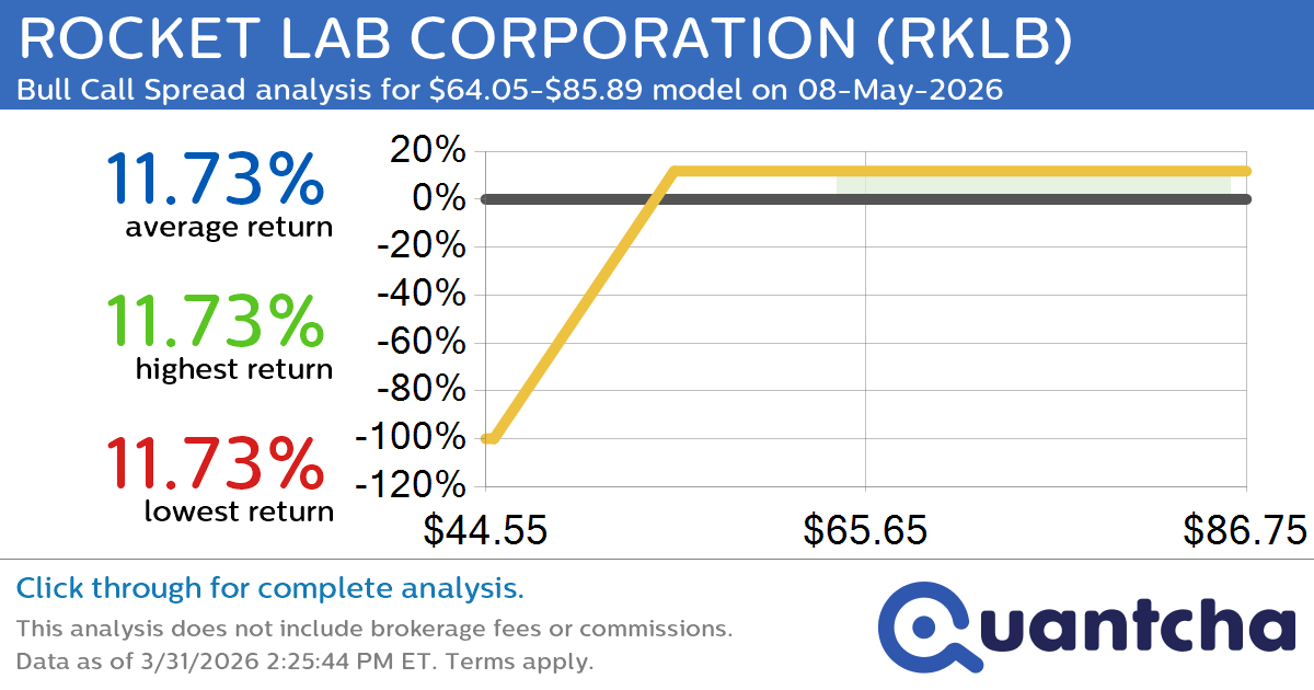 Quantchabot has detected a new Bull Call Spread trade opportunity for ROCKET LAB CORPORATION (RKLB) for the 8-May-2026 expiration period. You can analyze the opportunity in depth over at the Quantcha Options Search Engine.